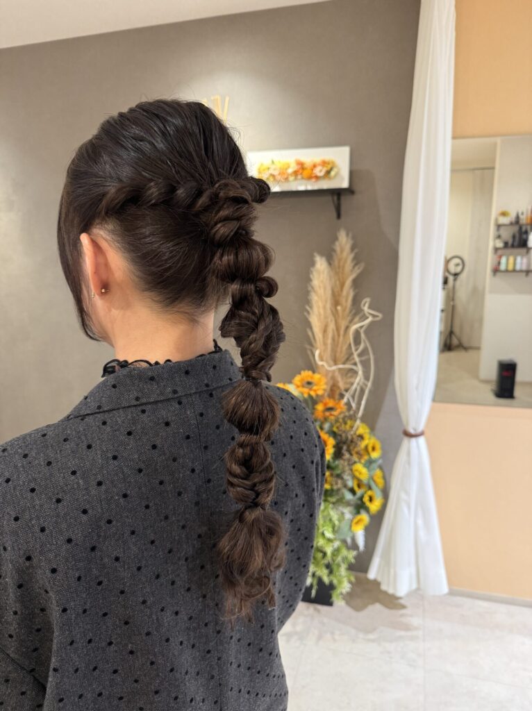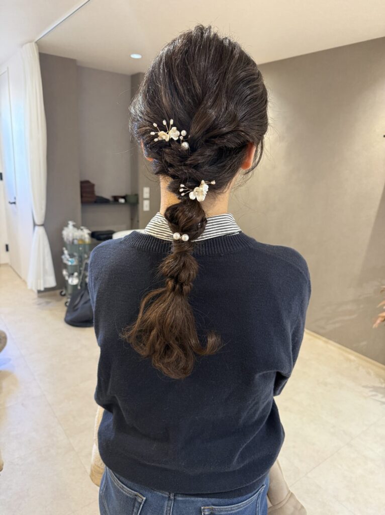 着物を着た時はこんな感じが素敵かな〜とかドレスだったらこっちかな〜とか、長さによっても今回みたいに編み下ろしたりも出来ますし、全部あげたりハーフアップにしたり、はたまたブローだけで仕上げたり、、