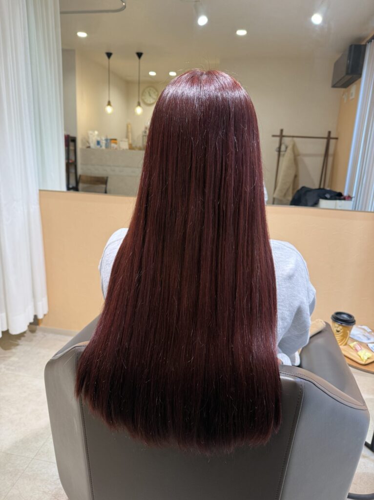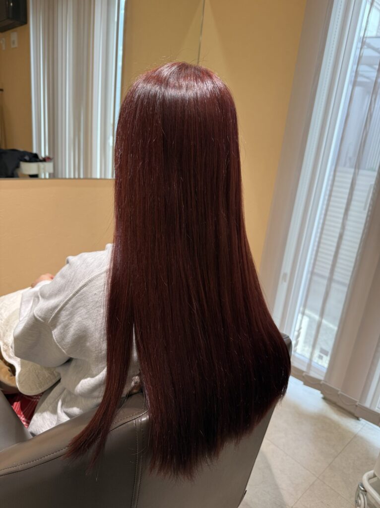 大体いつも同じ感じのカラーをするので、赤っぽい感じでさせて頂いているんですが、今回は特に気合いを入れて赤をしっかりと入れて、トリートメントもして艶々に仕上げました。